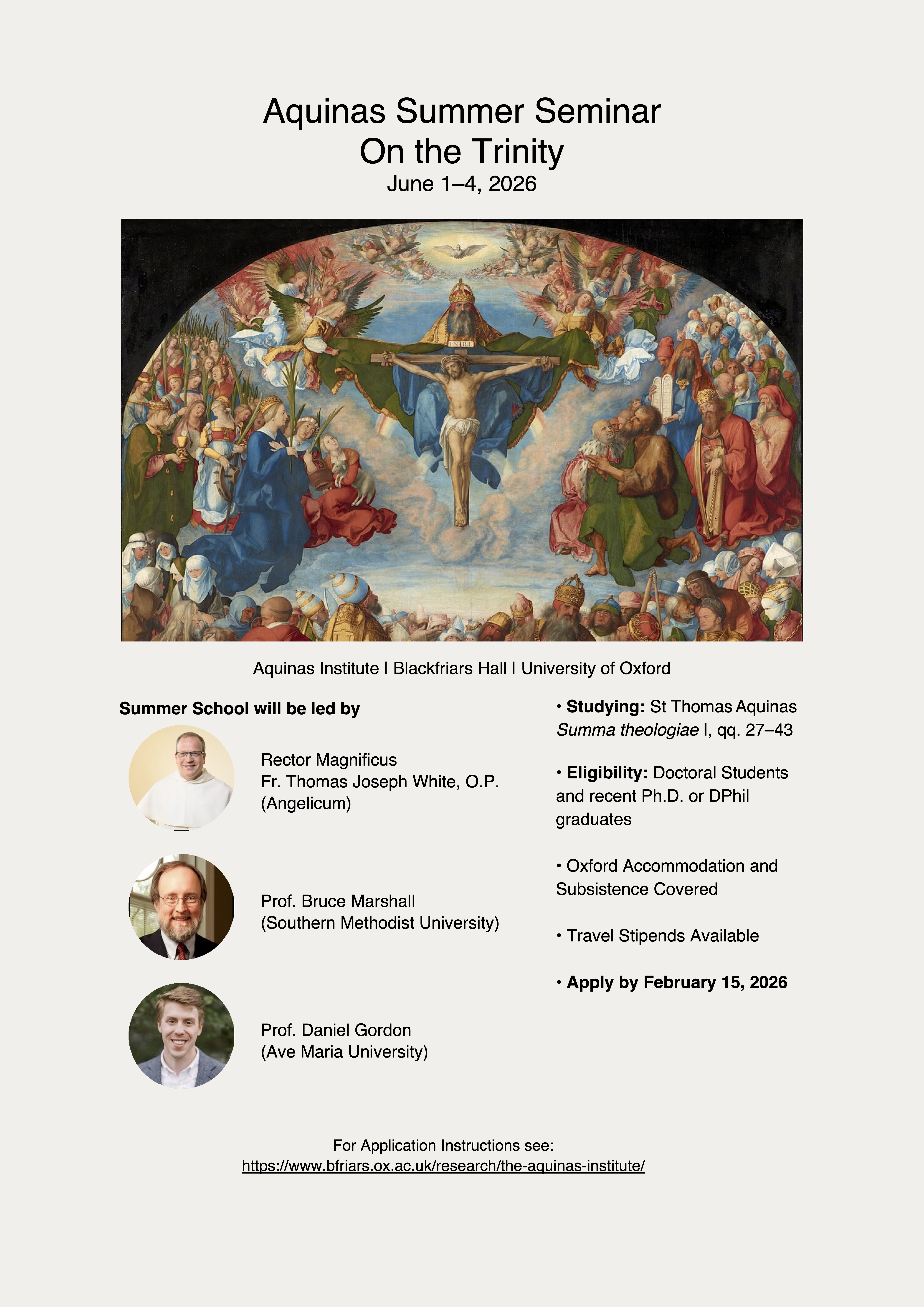 The Aquinas Institute at Blackfriars Hall, Oxford University is pleased to announce a call for applicants for the 2026 Aquinas Summer Seminar on the theme of trinitarian theology in St Thomas Aquinas. The event will run from Monday morning of June 1st, through Thursday evening of June 4th, 2026.